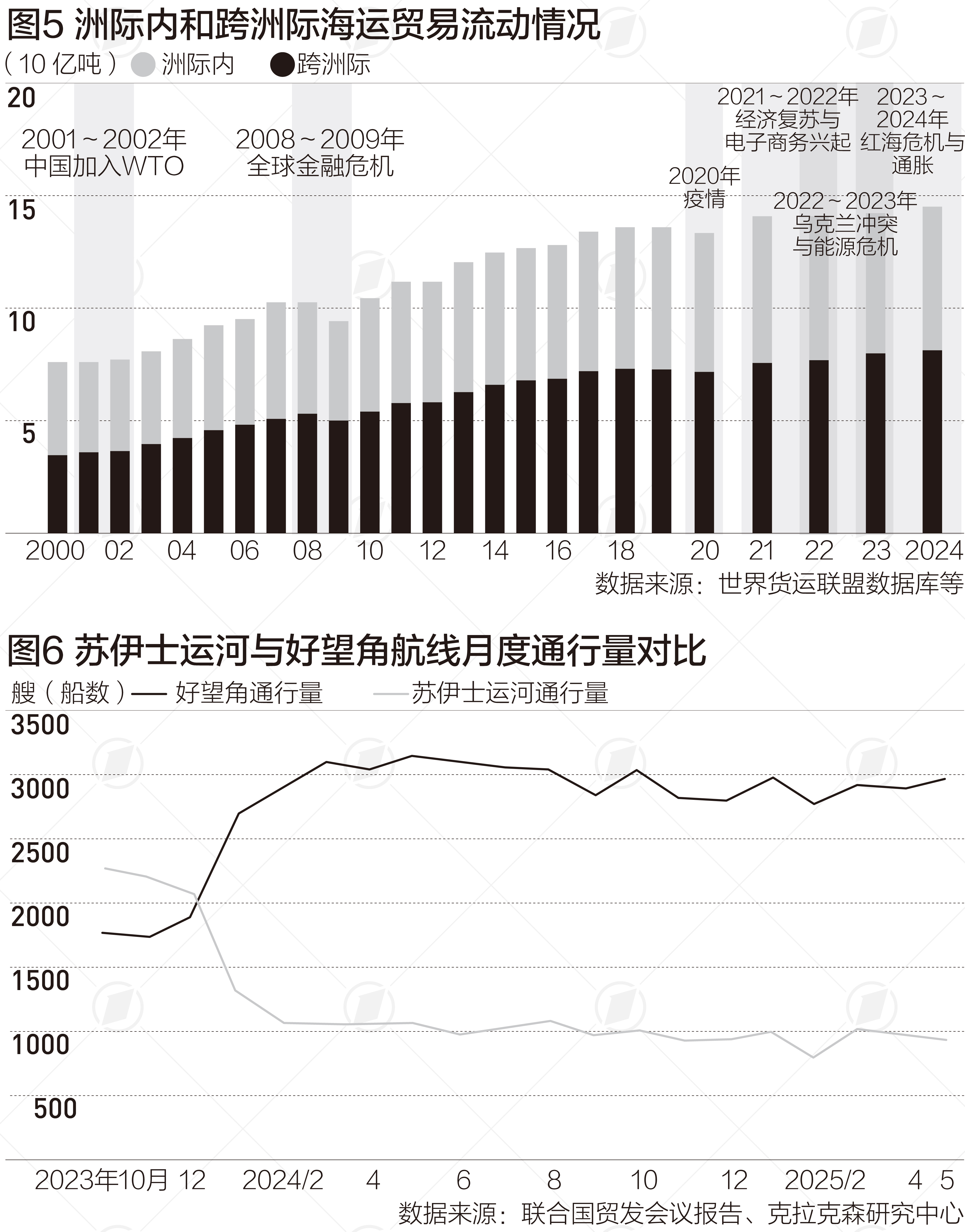 报告开篇显示,随着全球供应链的多样化和新消费中心出现,海上航线区域间的联系越来越紧密。过去20多年来,跨洲际贸易与洲际内海运贸易均稳步增长。但去年以来,一个显著的变化是,地缘政治的紧张局势导致长途航线变更,使船舶往来更加繁忙,吨英里(Ton-miles)增长了5.9%,创历史新高。