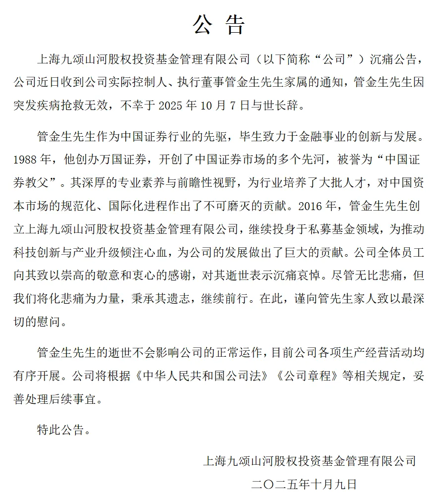 九颂基金:公司实际控制人管金生去世 财经资讯 2025-10-10 07:44:28 浏览 评论 10月9日晚间,九颂基金发布公告称,公司近日收到公司实际控制人、执行董事管金生先生家属的通知,管金生先生因突发疾病抢救无效,不幸于2025年10月7日与世长辞。 帮企客致力于为您提供最新最全的财经资讯,想了解更多行业动态,欢迎关注本站。 上一篇: 以媒公布停火协议文本 以军撤军72小时后所有人质将被释放 下一篇: 本文地址: https://lc.zpt966033.com/cjzx/1249812.html 版权声明:如无特殊标注,文章均为本站原创,转载时请以链接形式注明文章出处。