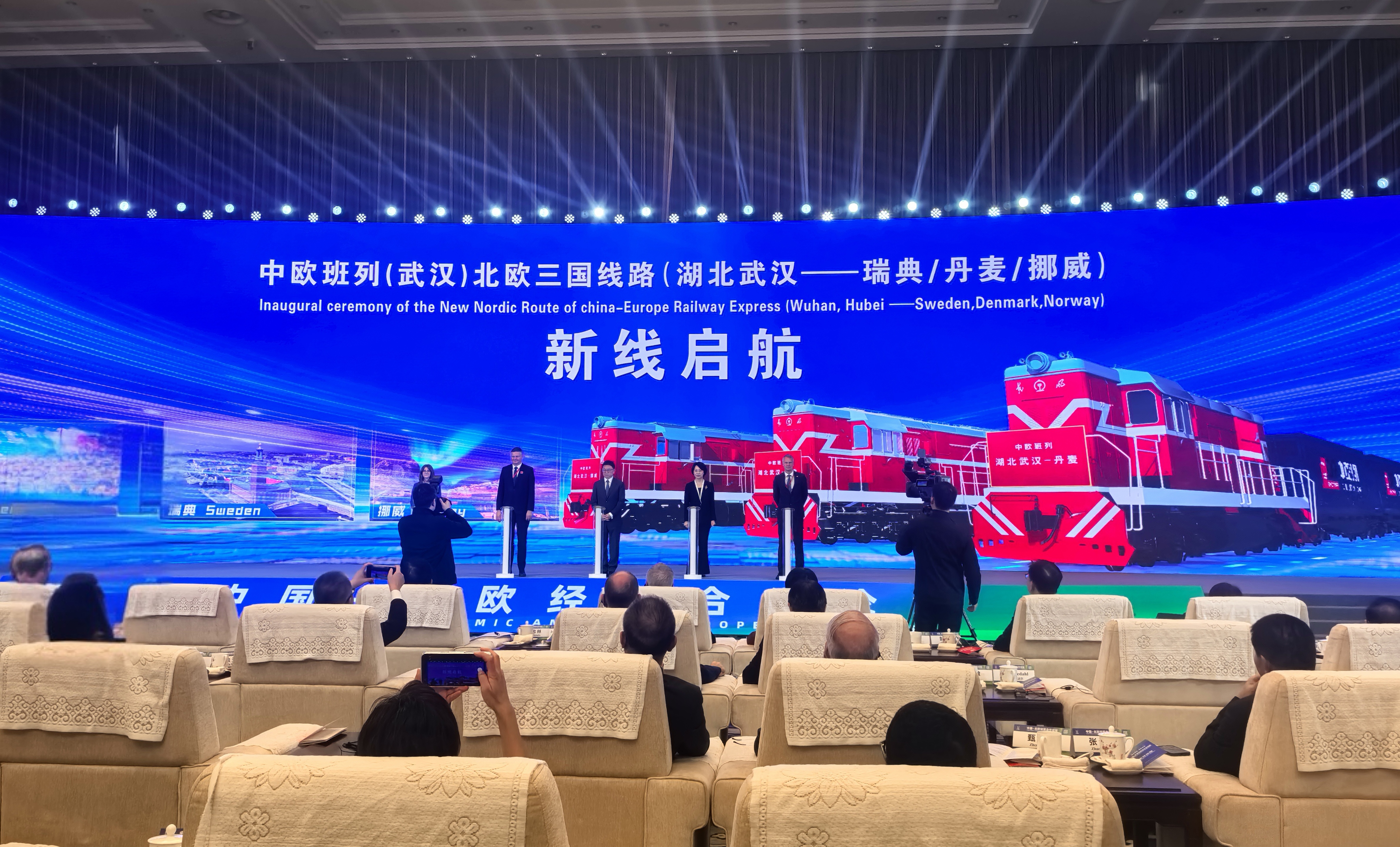 开幕式上,中欧班列(武汉)北欧三国线路(湖北武汉-瑞典/丹麦/挪威)新线正式启航。