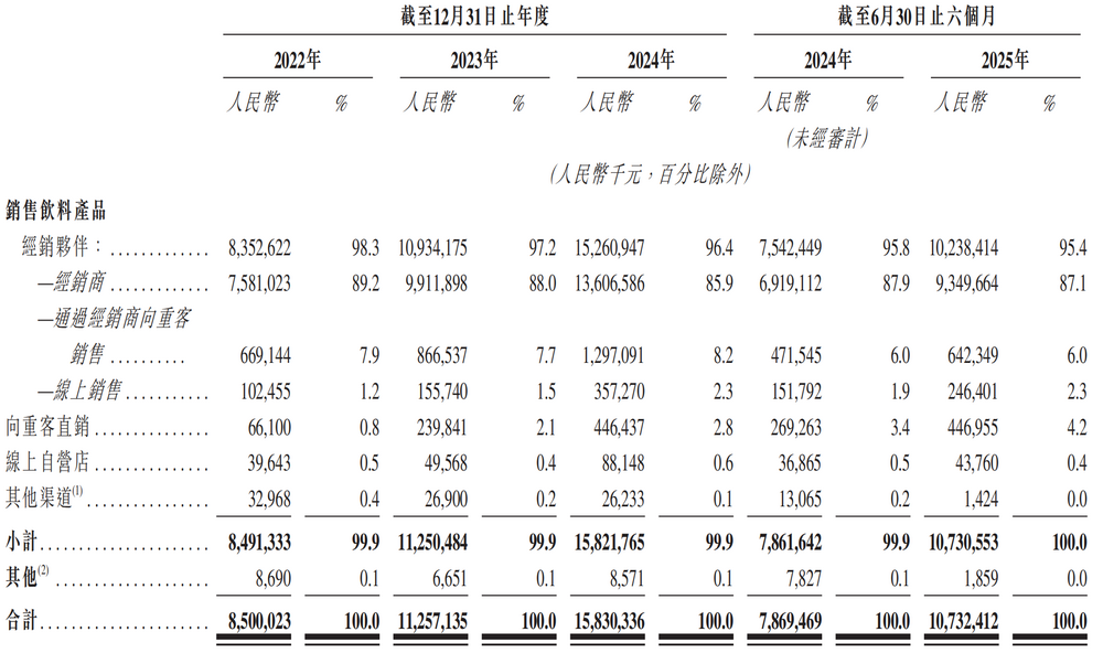 经销商在扩大东鹏饮料的地理覆盖范围和推动产品销售方面发挥出重要作用,其主要依靠经销网络推广及销售产品,并从经销商处获得绝大部分收入。2022年至2024年及2025年上半年,东鹏饮料向经销商销售产生的收入分别为75.81亿元、99.12亿元、136.07亿元和93.50亿元,占营收的比例分别为89.2%、88.0%、85.9%和87.2%,常年维持在较高水平。