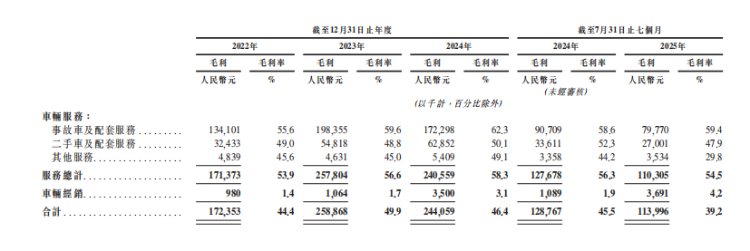 客单价持续下滑不仅侵蚀利润,更凸显其高昂的销售成本。2025年前7个月,博车网销售成本达1.76亿元,占营收比重60.8%。尽管较2024年全年(62.6%)略有下降,但仍处于高位,反映出其渠道与控制能力持续承压。2022年至2025年前7个月,其毛利率从44.4%波动下滑至39.2%。
