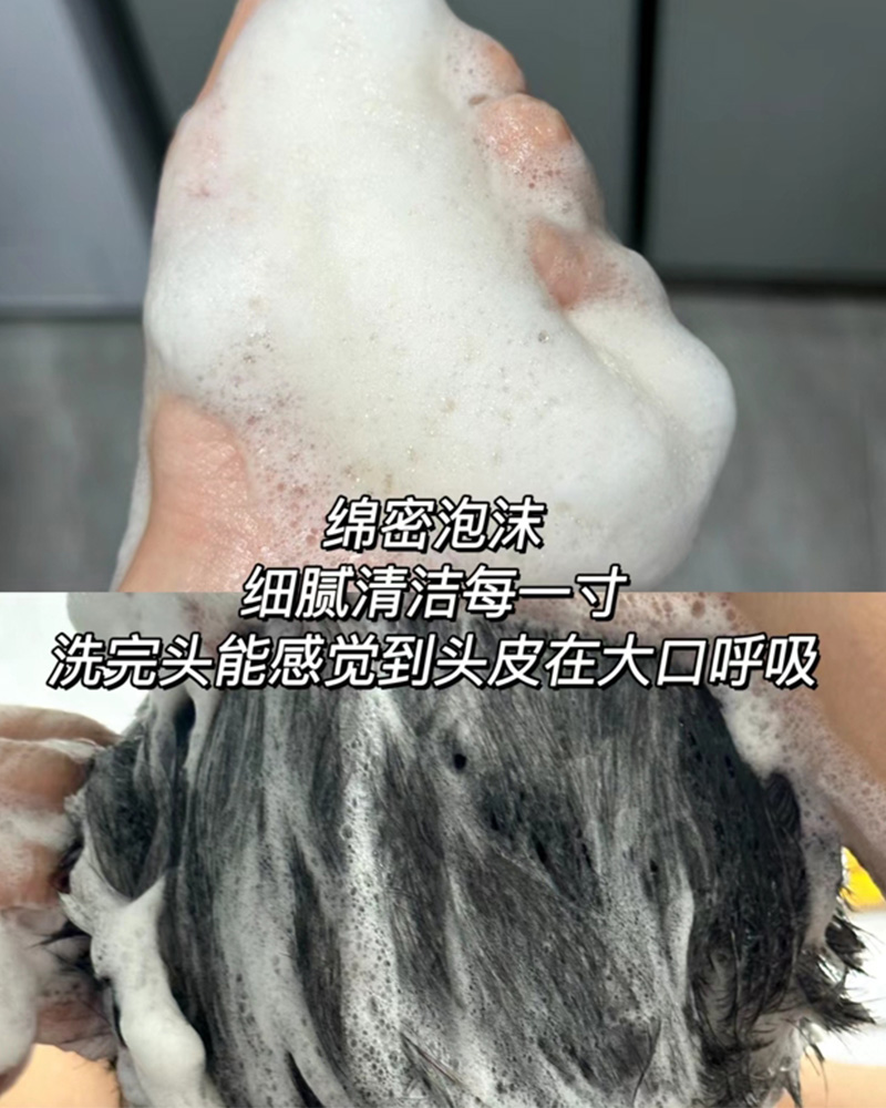 使用方法:打湿头发后,取适量于掌心,加水揉搓出丰富且细腻的冰爽质感泡沫,充分按摩头皮2-3分钟,让活性成分充分作用,再以温水彻底冲洗,无硅油残留,无假滑感。