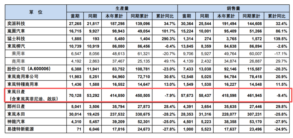今年9月,东风日产销量为57673辆,去年同期为58437辆,同比下滑1.3%;而今年1—9月,东风日产累计销量为418598辆,去年同期为461945辆,同比下滑9.4%。