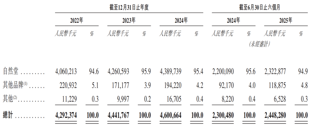 值得注意的是,旗舰品牌“自然堂”贡献了绝大部分营收。2022年至2024年及2025年上半年,旗舰品牌“自然堂”贡献收入分别为40.60亿元、42.61亿元、43.90亿元和23.23亿元,占营收的比例分别为94.6%、95.9%、95.4%和94.9%。“自然堂”收入占比常年占据九成以上,反映出自然堂对单一品牌的依赖程度之高,也反映出其他品牌的收入贡献微乎其微。