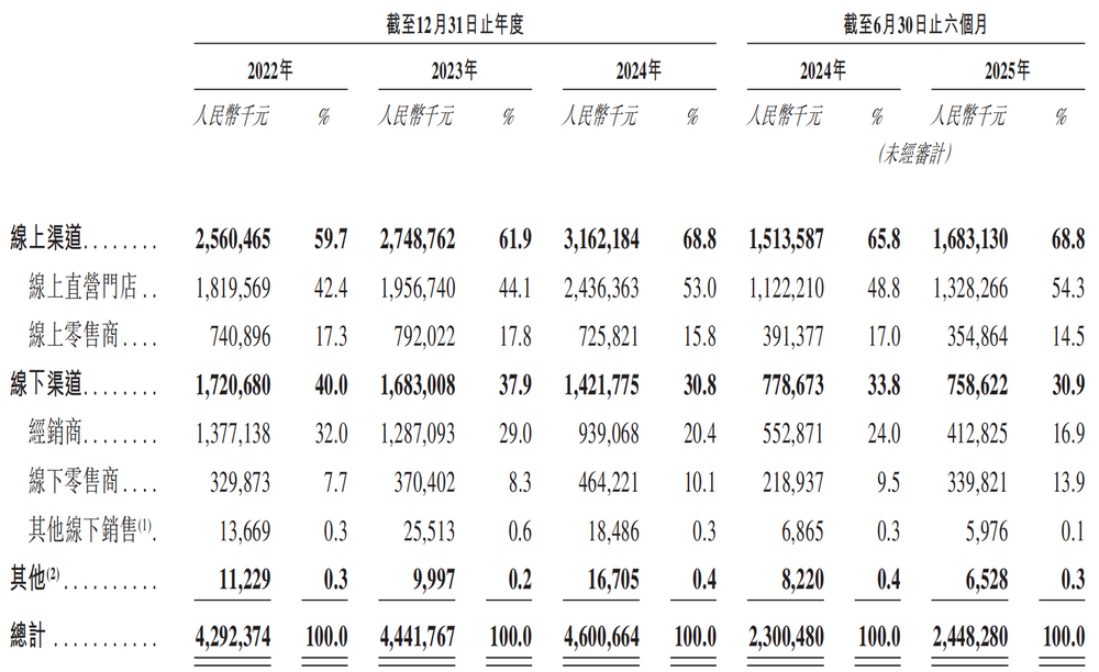 线上销售渠道占比过高是另一大隐忧。自然堂依靠第三方线上平台进行产品的线上销售,包括天猫、抖音、京东、拼多多、快手、小红书、唯品会及微信视频号等。2022年至2024年及2025年上半年,自然堂来自线上直营门店的收入分别为18.20亿元、19.57亿元、24.36亿元和13.28亿元,占营收的比例分别为42.4%、44.1%、53.0%和54.3%,呈现逐年增长的趋势。如果再加上线上零售商贡献的收入,那么线上渠道收入占比分别高达59.7%、61.9%、68.8%和68.8%,可见线上渠道已成为自然堂业绩增长的关键支撑。
