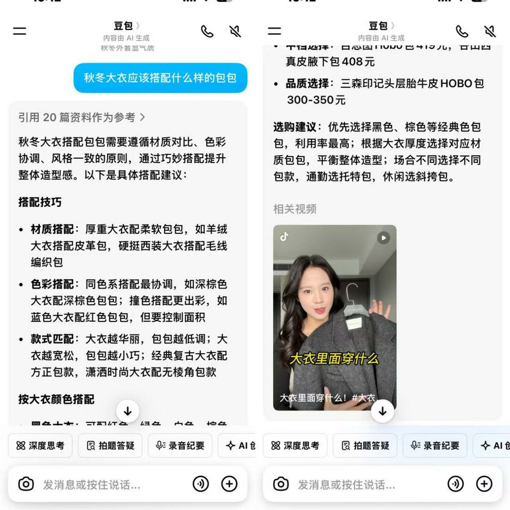 与此同时,字节生态的协同版图还在继续扩大。AI产品豆包也已开始接入抖音电商体系。比如,当咨询“秋冬大衣搭配”等消费话题时,豆包不仅会给出专业建议,还会智能推荐相关抖音博主的穿搭视频,用户点击即可沉浸式浏览。也有用户反应,部分场景下还会直接嵌入抖音商城商品链接,实现一键购买。