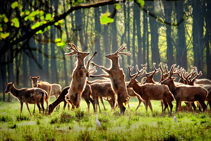 在一条林中小路上,他们看到了一整群野生麋鹿从眼前奔跑而过。“太震撼了,不亚于去肯尼亚看动物迁徙!”