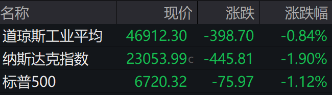 当地时间周四,美股三大股指全线下滑,截至收盘,道指跌0.84%,标普500指数跌1.12%,纳指跌1.90%。