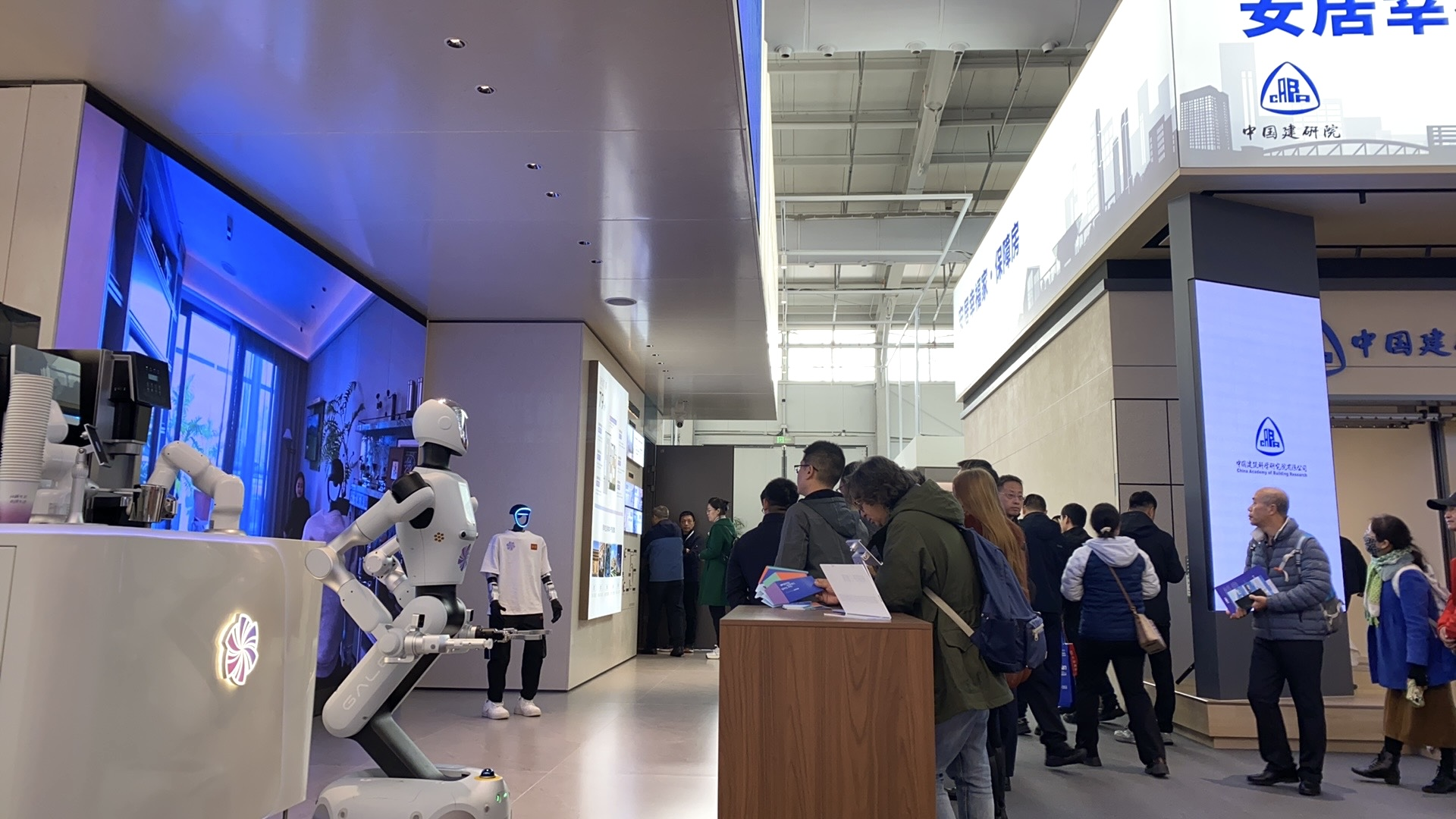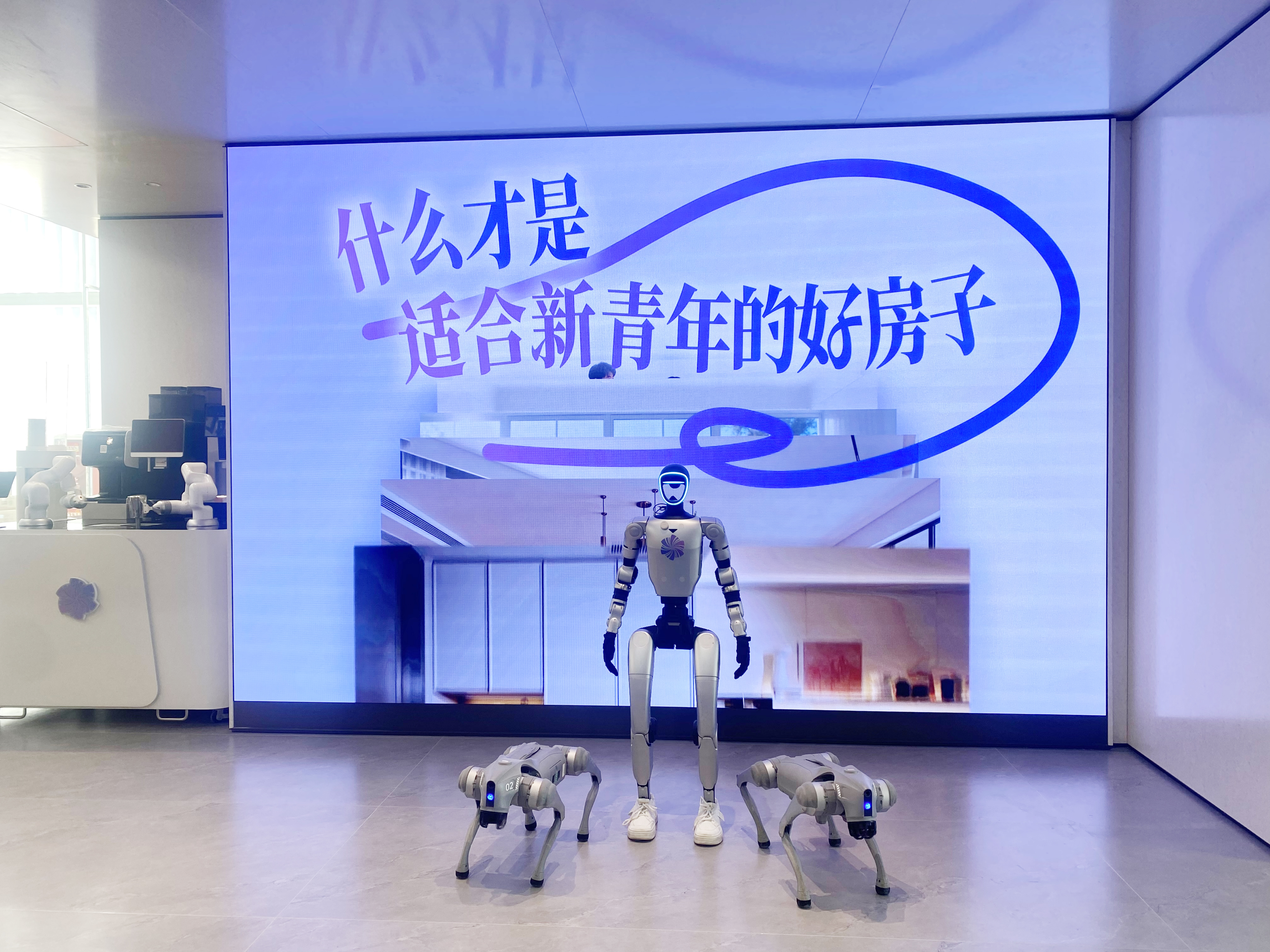 走近新青年好房子样板间,映入眼帘的是咖啡机器人自助服务体验,线上下单、机器臂制作、再由轮足具身机器人端送到客户手中,全程丝滑服务。人形机器人全程导览讲解,带领参观者走至室内,只需呼叫“联小智”,室内全屋灯光、家电以及可变空间等全部可自动开启,科技感直接拉满。