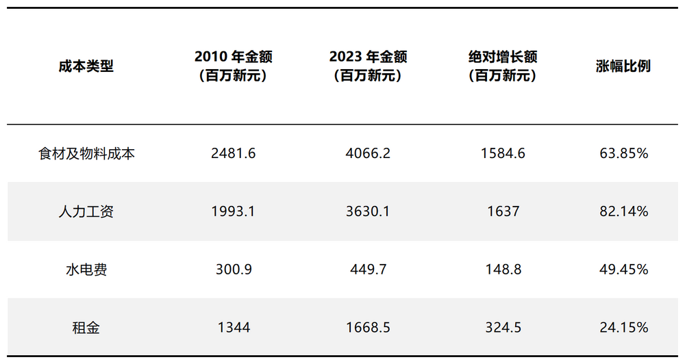 闭店潮的根源,在于新加坡餐饮业“不涨价亏利润,涨价亏客流”的致命困局。新加坡国家统计数据印证了成本端的重压:2011-2023年间,食材及物料总支出从24.81亿新元暴涨至40.66亿新元,涨幅高达63.85%;人力工资支出涨幅更飙升至82.14%。