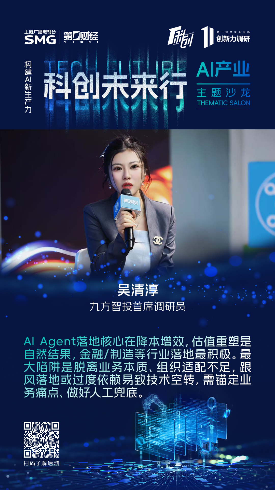8.九方智投首席调研员吴清淳:Al Agent落地核心在降本增效,估值重塑是自然结果,金融制造等行业落地最积极。最大陷阱是脱离业务本质、组织适配不足,跟风落地或过度依赖易致技术空转,需锚定业务痛点、做好人工兜底。