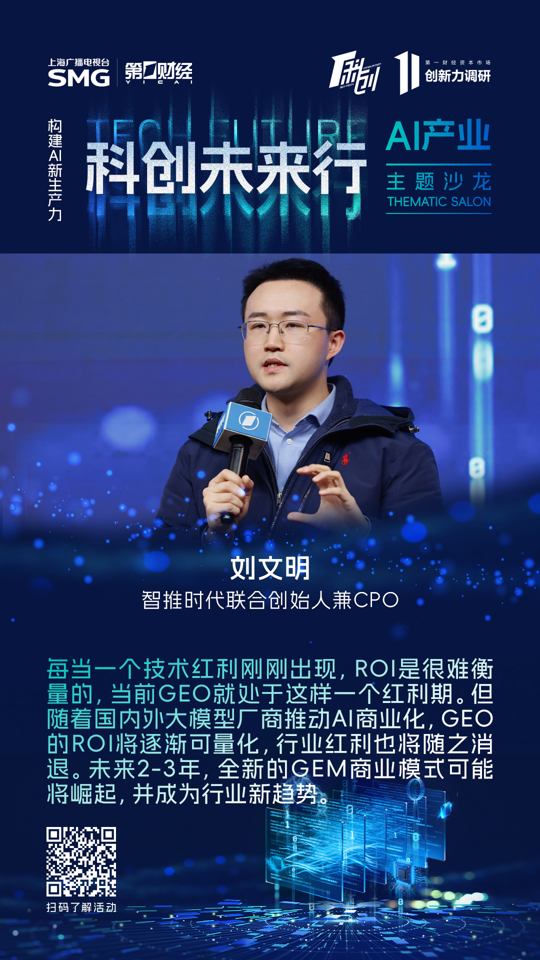 11.智推时代联合创始人兼CPO刘文明:每当一个技术红利刚刚出现,ROI是很难衡量的,当前GEO就处于这样一个红利期。但随着国内外大模型厂商推动AI商业化,GEO的ROI将逐渐可量化,行业红利也将随之消退。未来2-3年,全新的GEM商业模式可能将崛起,并成为行业新趋势。