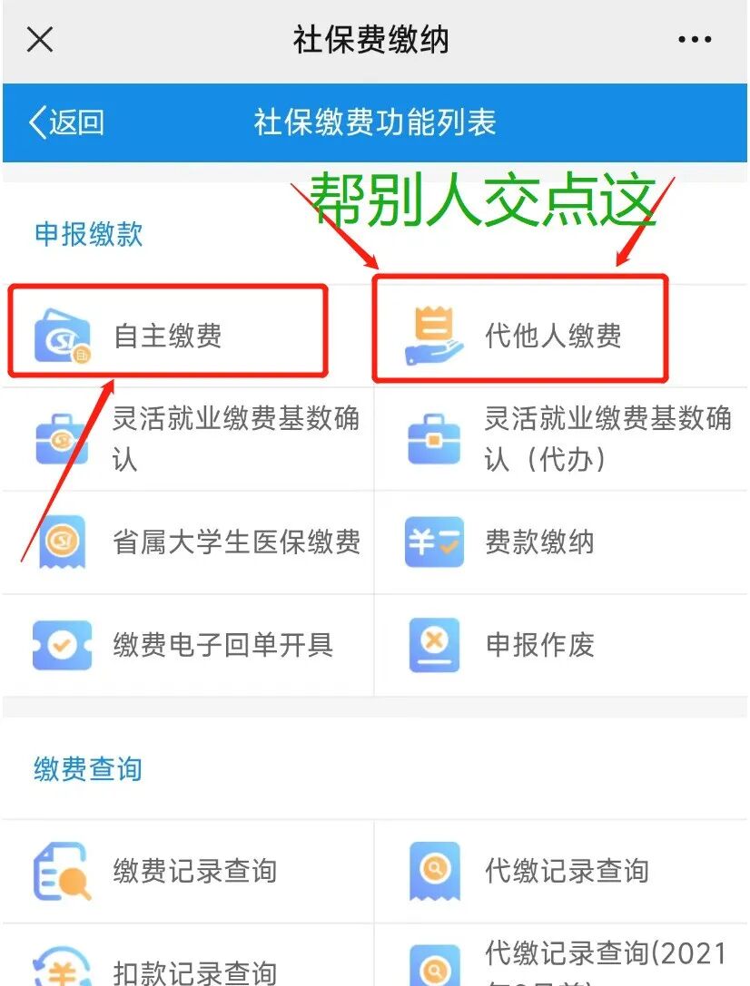 点击自主缴费、代他人缴费