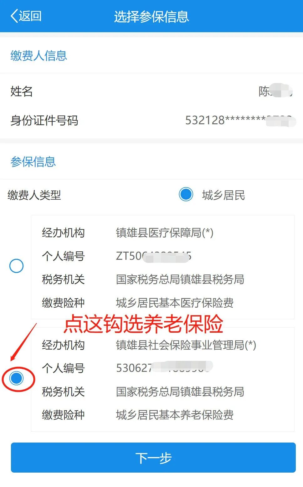 勾选缴费人类型后点击下一步